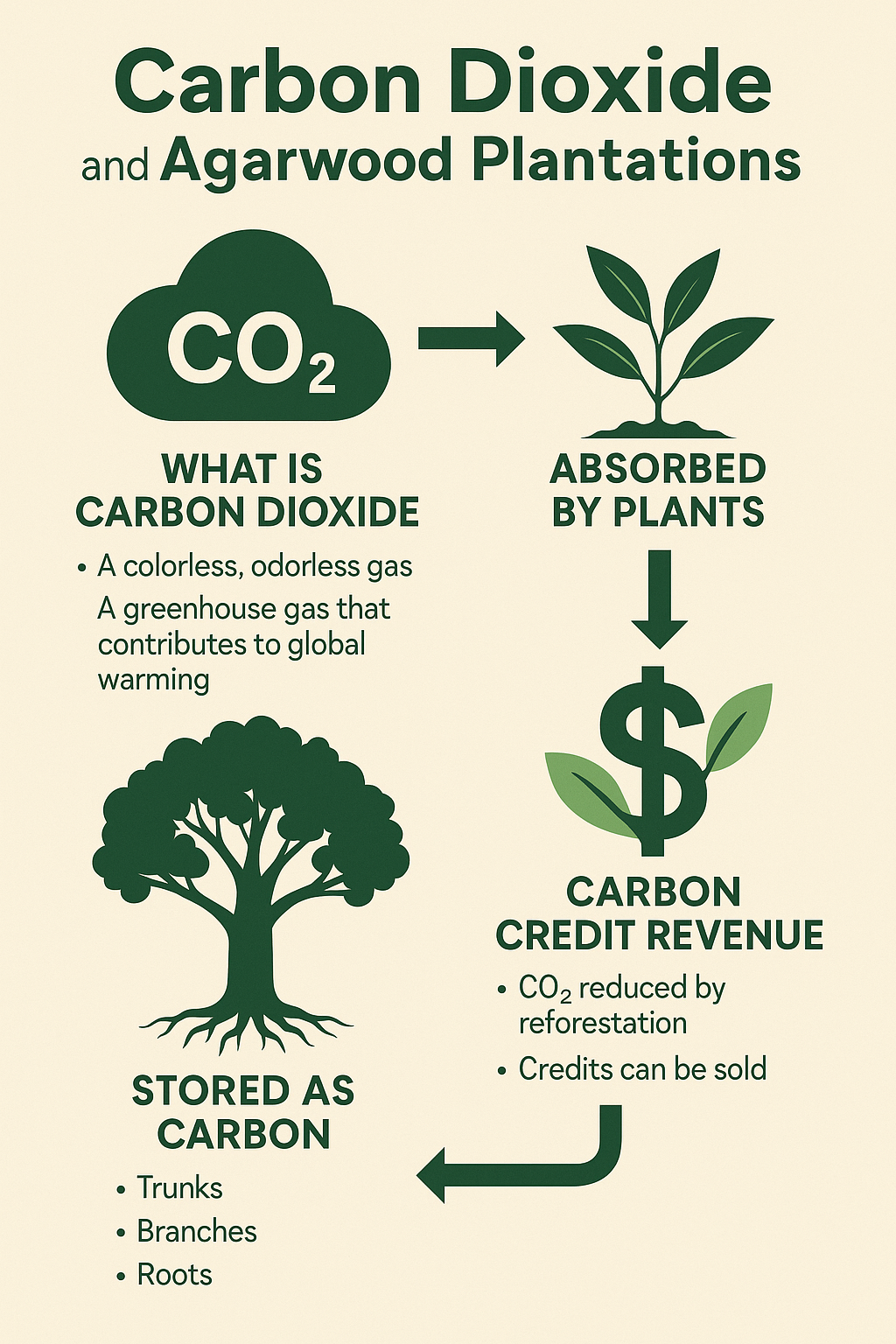 • Aquilaria spp. absorb CO₂ during growth, storing carbon in trunks, branches, and roots.