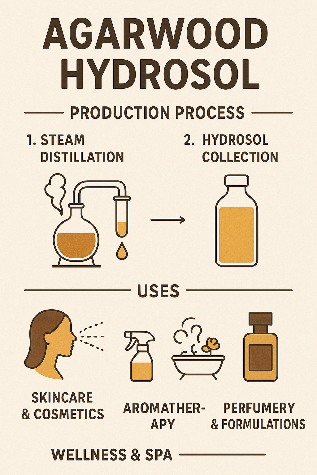 Hydrosol, also called Agarwood Floral Water, is the aromatic water that remains after steam distillation of agarwood. Unlike essential oil, which is highly concentrated, hydrosol is gentler and carries the water-soluble compounds of agarwood resin and wood.