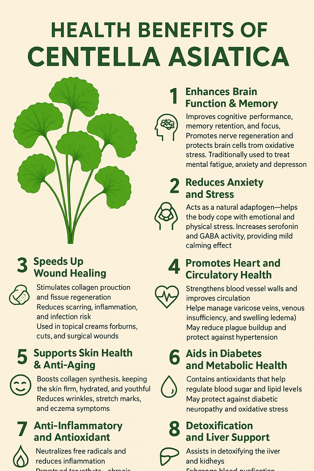 🩹 Tip: Centella extracts (like Madecassol or Cica creams) are widely used in skincare for healing and soothing effects.